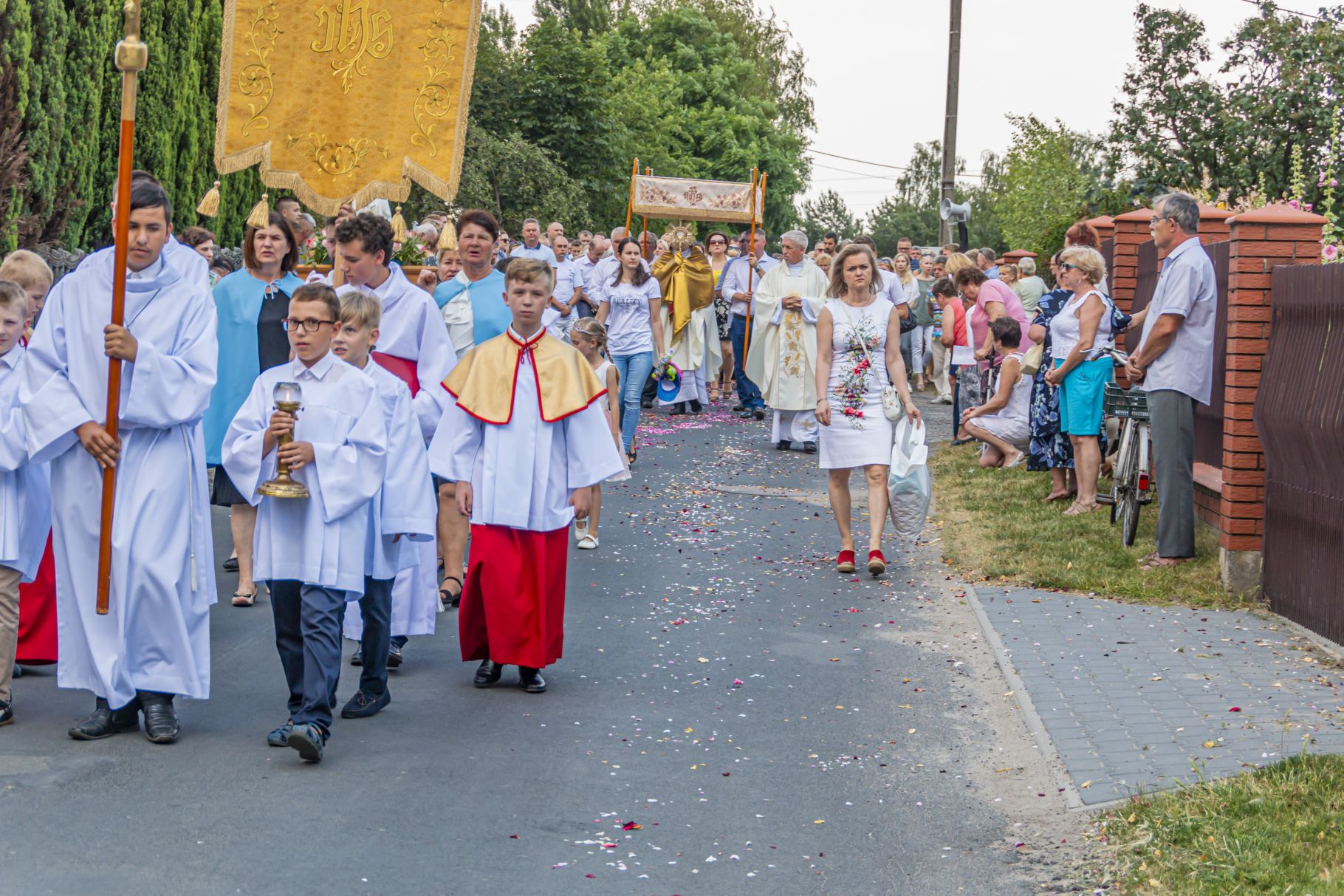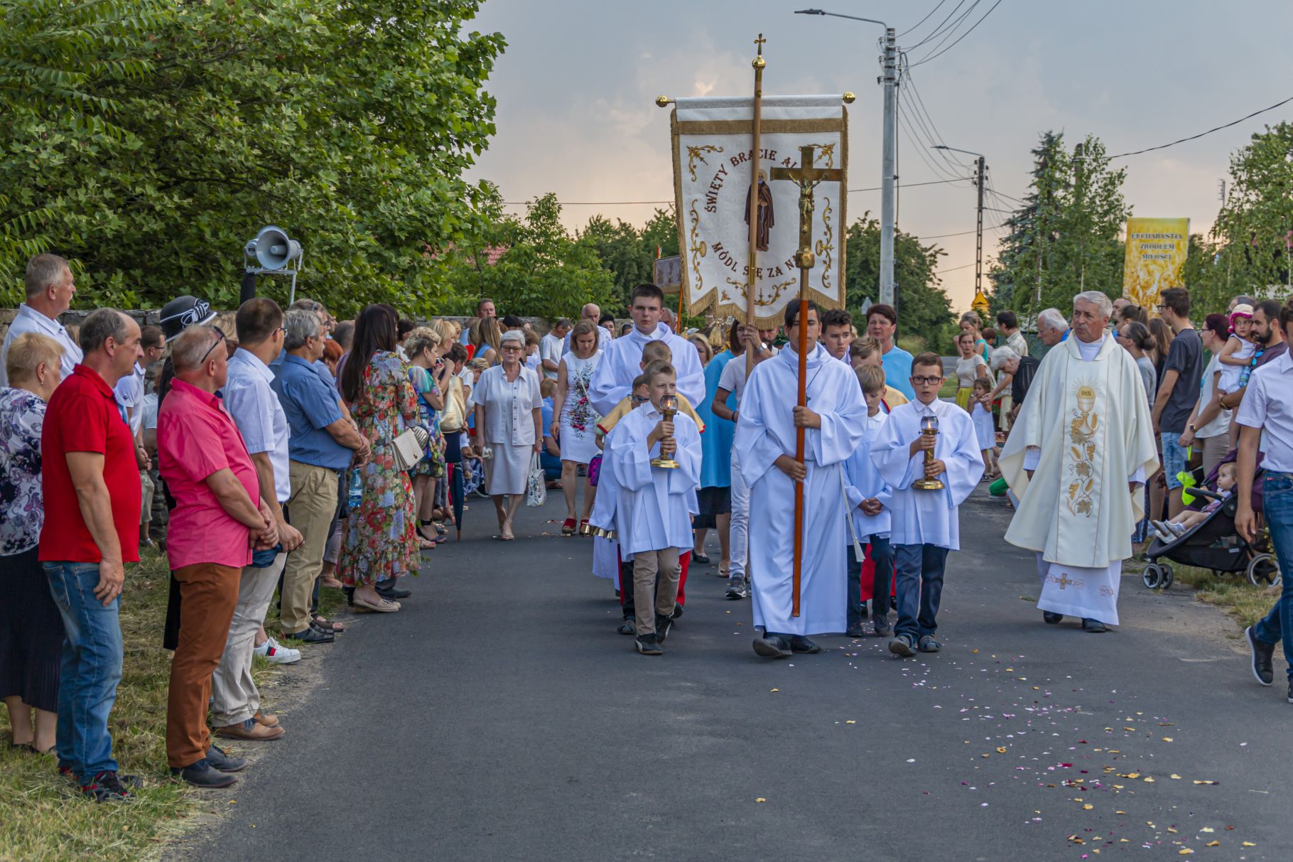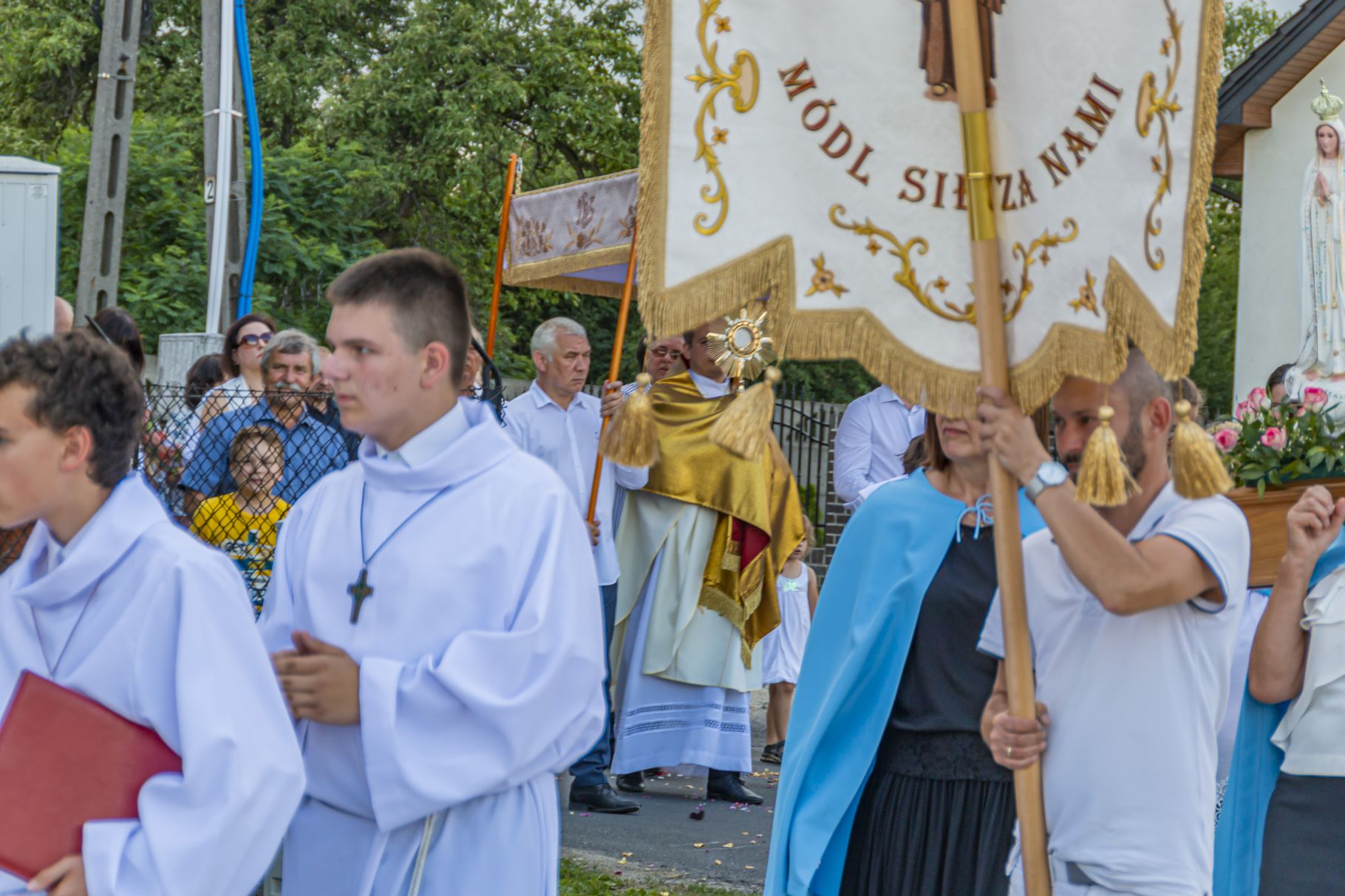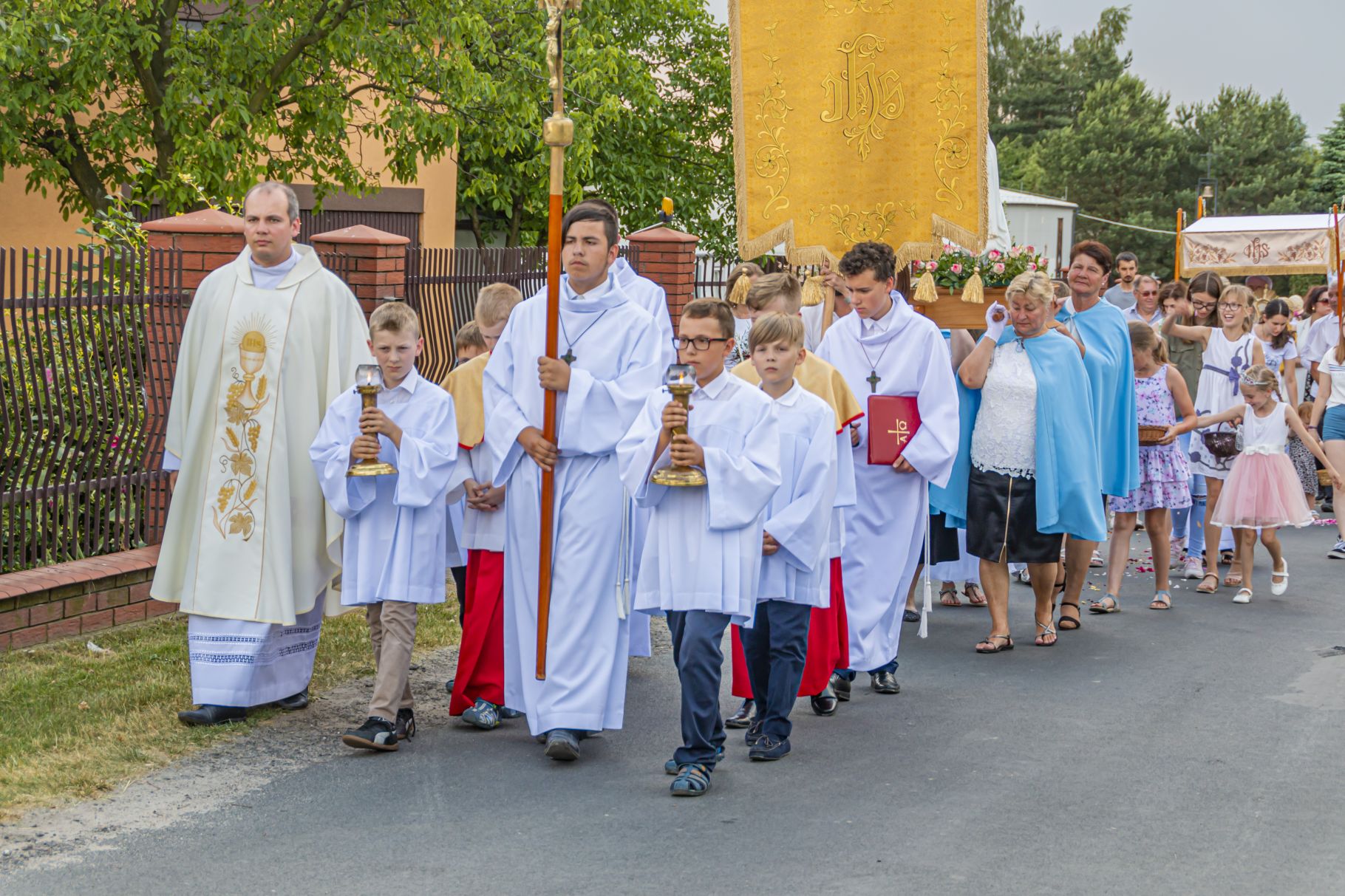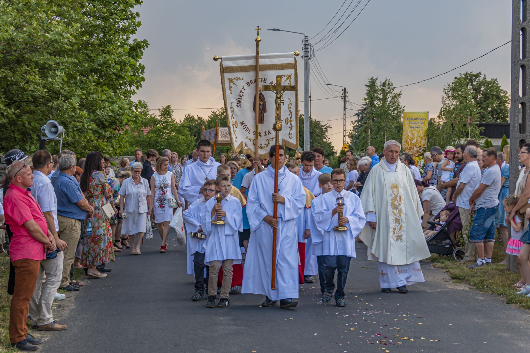 Uroczystość Najświętszego Ciała i Krwi Pańskiej. Raz w roku uroczysta procesja wędruje ulicami naszych parafii z Najświętszym Sakramentem. Wszystko po to, by wyznać wiarę w realną obecność Boga w małym kawałku chleba. Po Mszy św. o godz. 16.00 wyruszyła procesja do czterech ołtarzy. Szliśmy śpiewając pieśni Eucharystyczne i modląc się o błogosławieństwo Boże dla rodzin naszej parafii. . Dziękujemy wszystkim, którzy zaangażowali się w przygotowanie procesji.