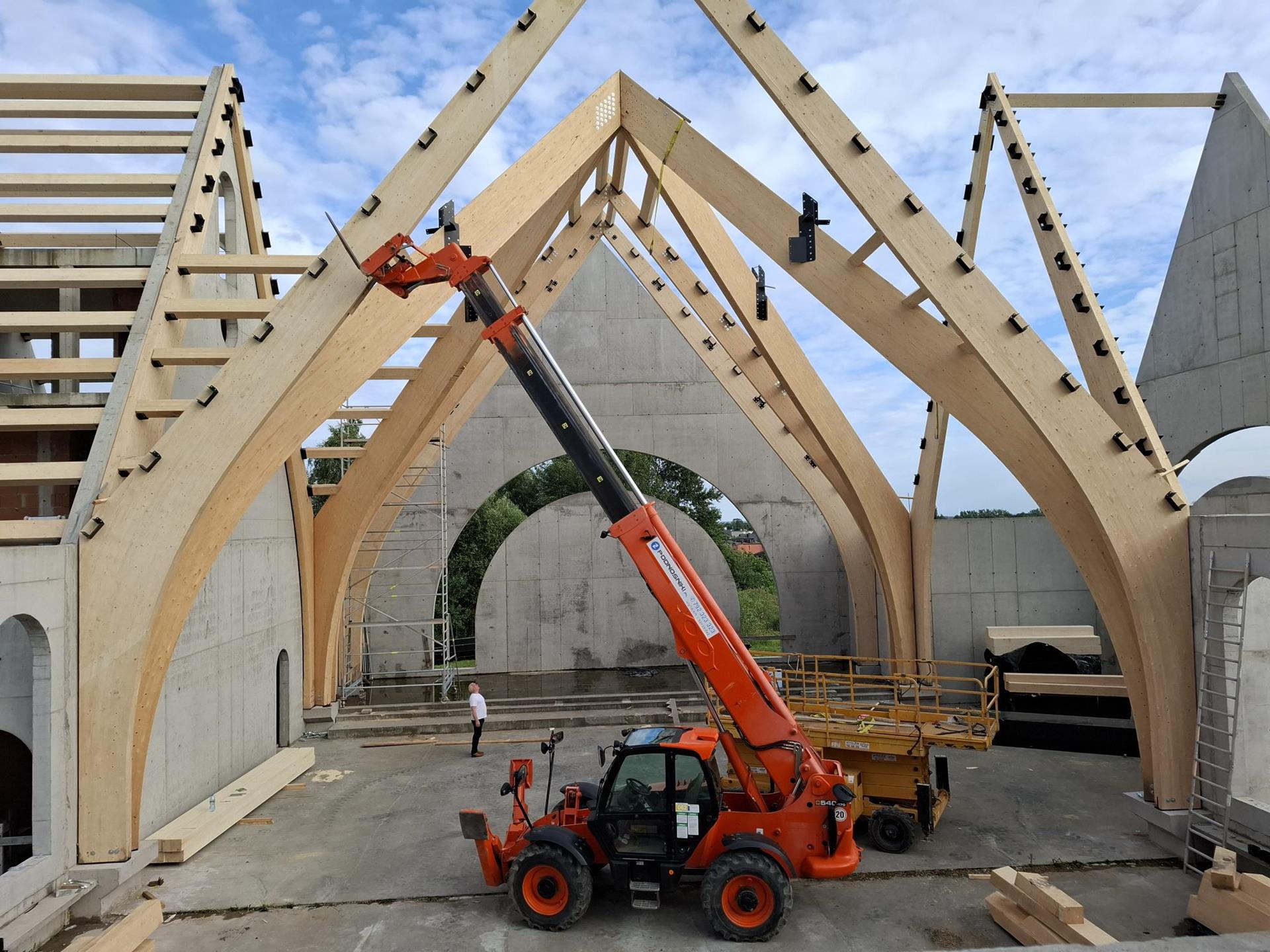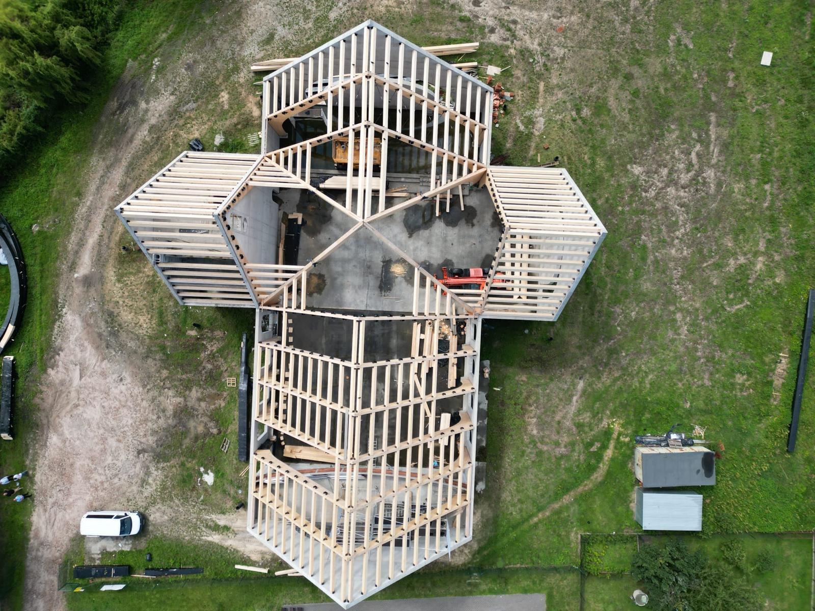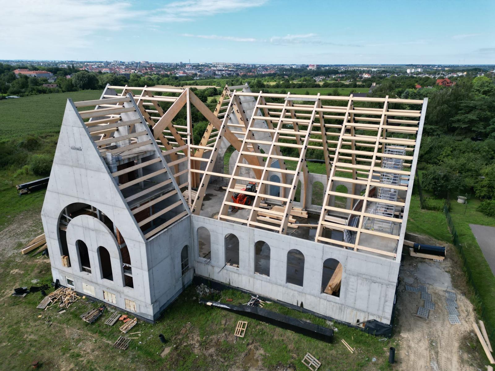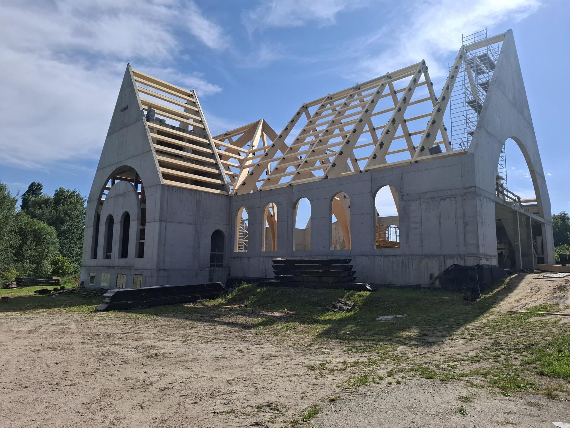 W poniedziałek 17 czerwca rozpoczął się kolejny etap budowy kościoła, na który składa się montaż konstrukcji z drewna klejonego wewnątrz kościoła, wzniesienie wieży oraz przykrycie kościoła i wieży blachą aluminiową.