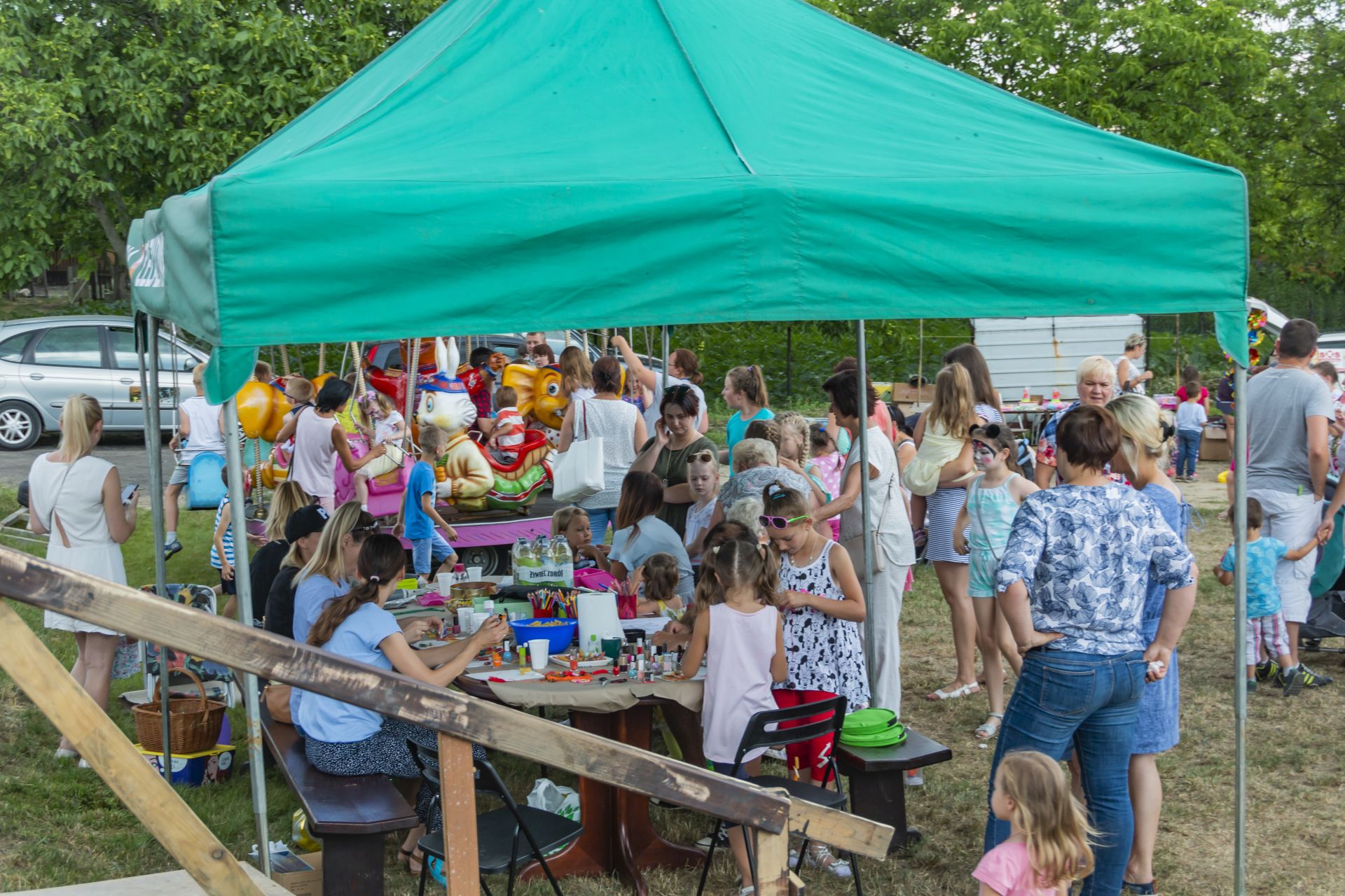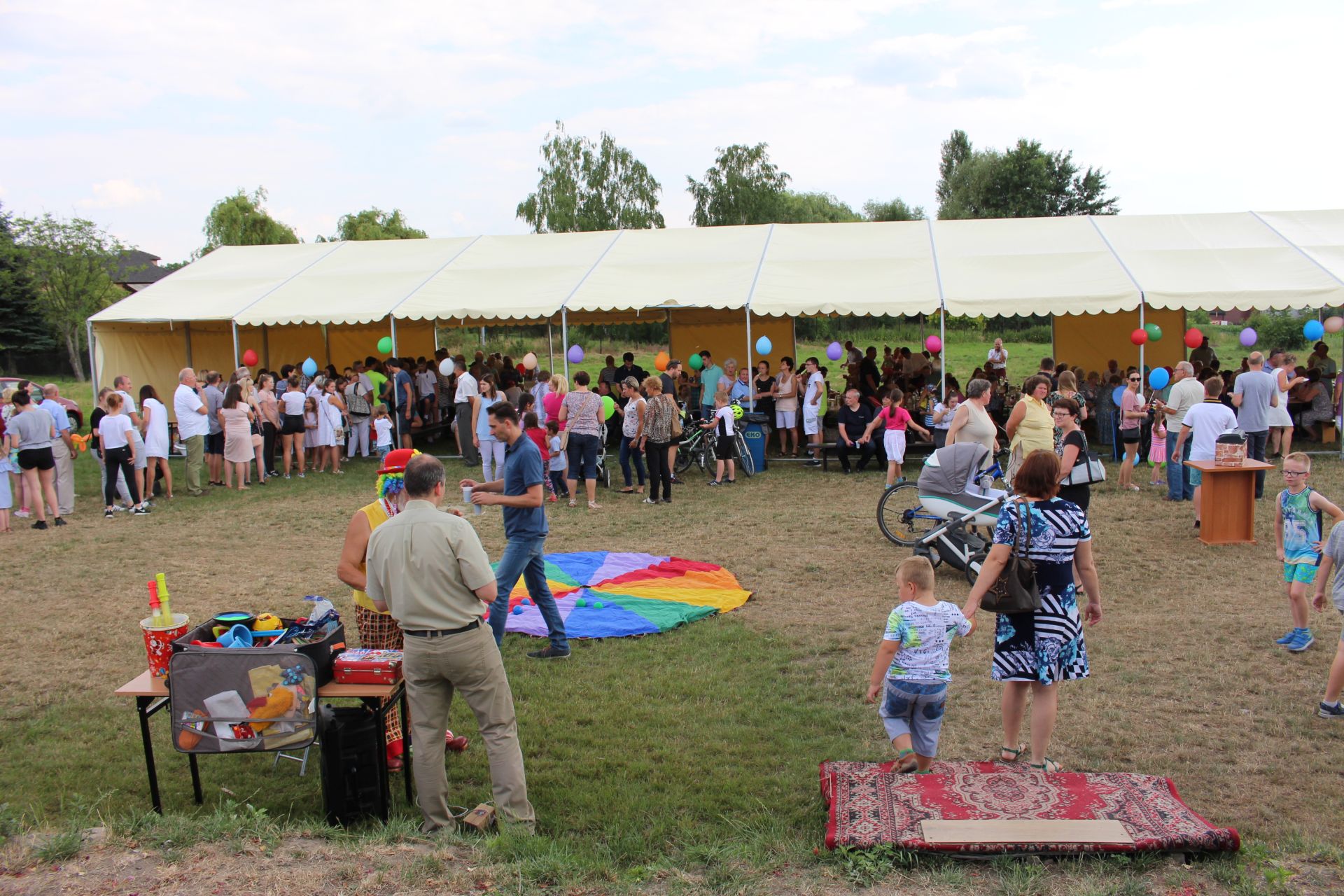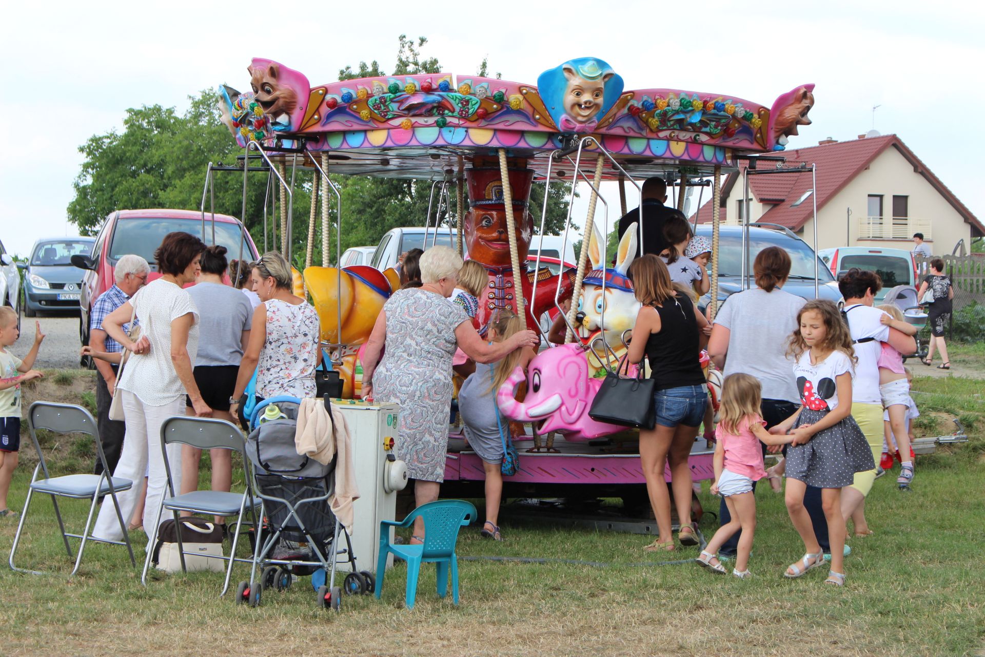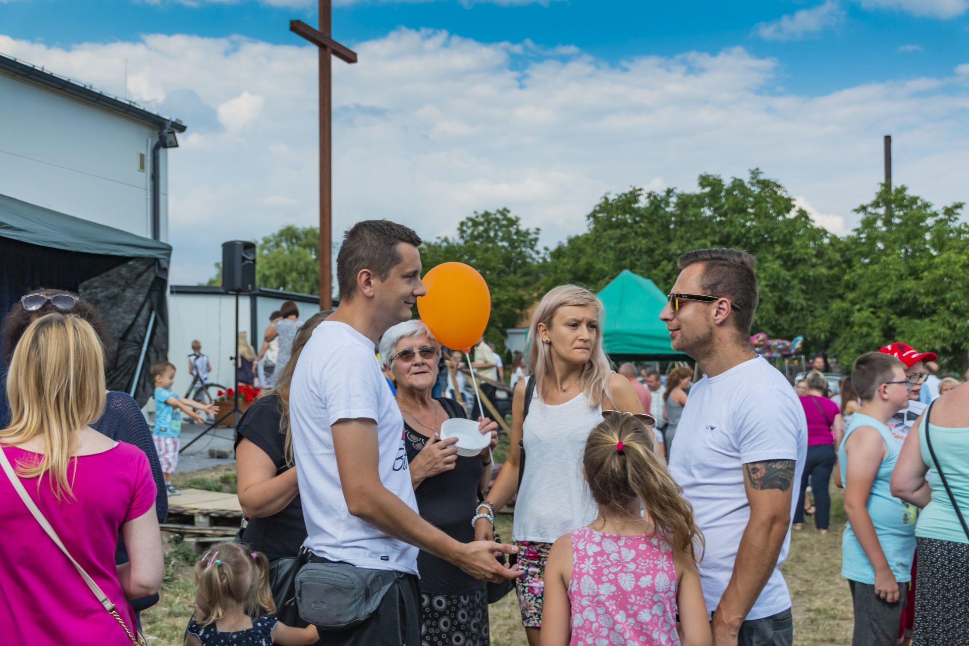 Po południu na łące za kaplicą odbył się festyn parafialny. Było mnóstwo atrakcji przygotowanych dla dzieci - karuzele, iluzjonista, klaun, malowanie twarzy, robienie biżuterii, oraz różne gry i zabawy. Dla każdego też było coś do jedzenia - kiełbaski z grilla, ciasta, szaszłyki z owoców oraz przepyszny chleb ze smalcem. Każdy kto chciał - i dla kogo starczyło losów - mógł również wziąć udział w loterii fantowej. Okazało się, że zainteresowanie loterią było tak duże, że przygotowane 500 losów rozeszło się bardzo szybko. Dochód z całego festynu przeznaczony jest na budowę naszego kościoła.