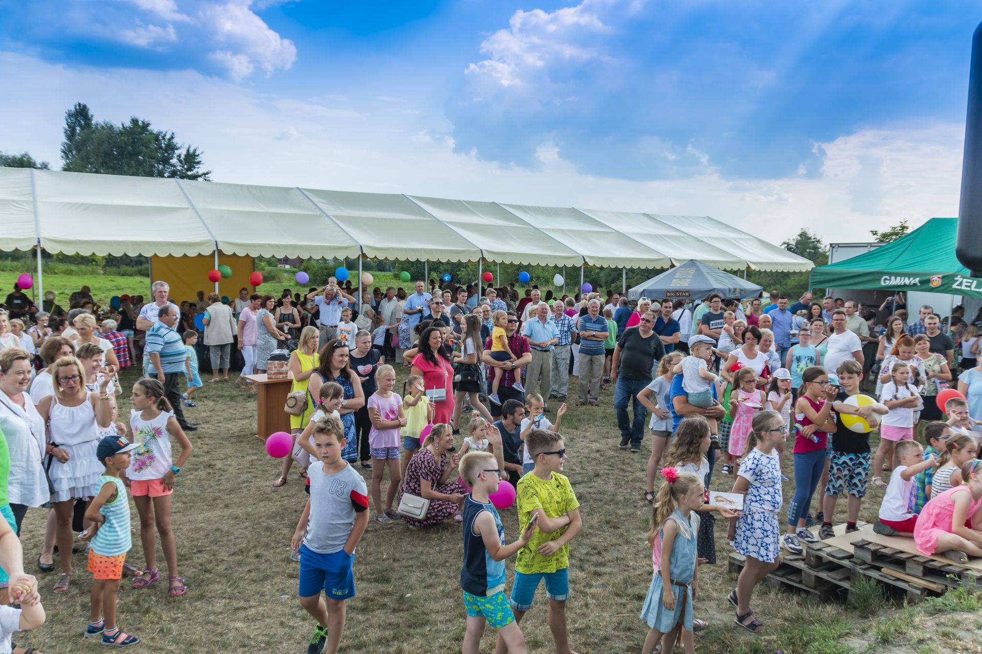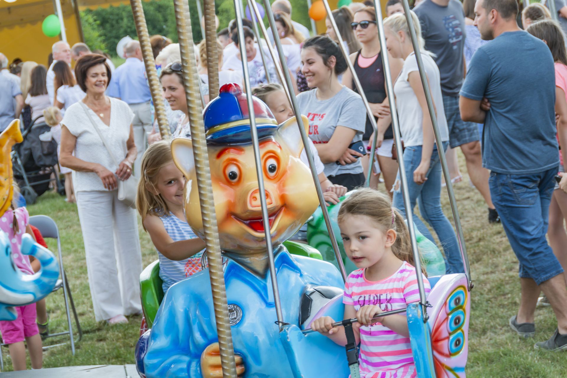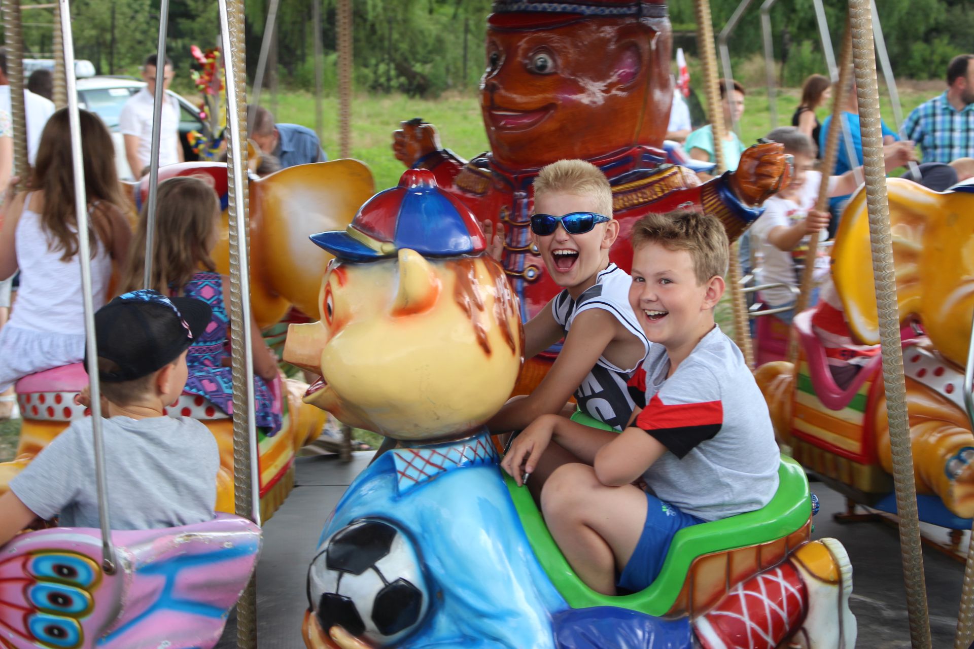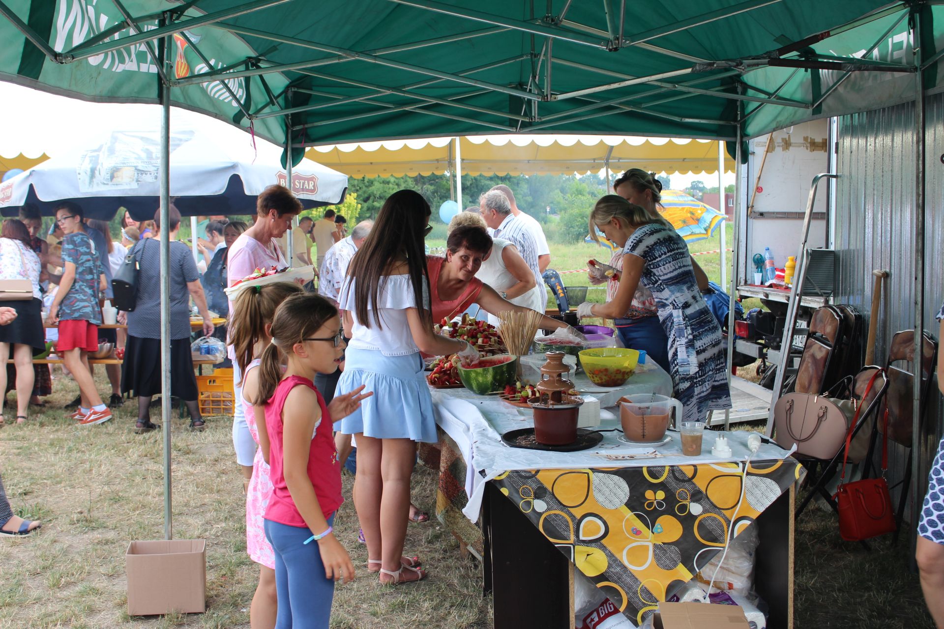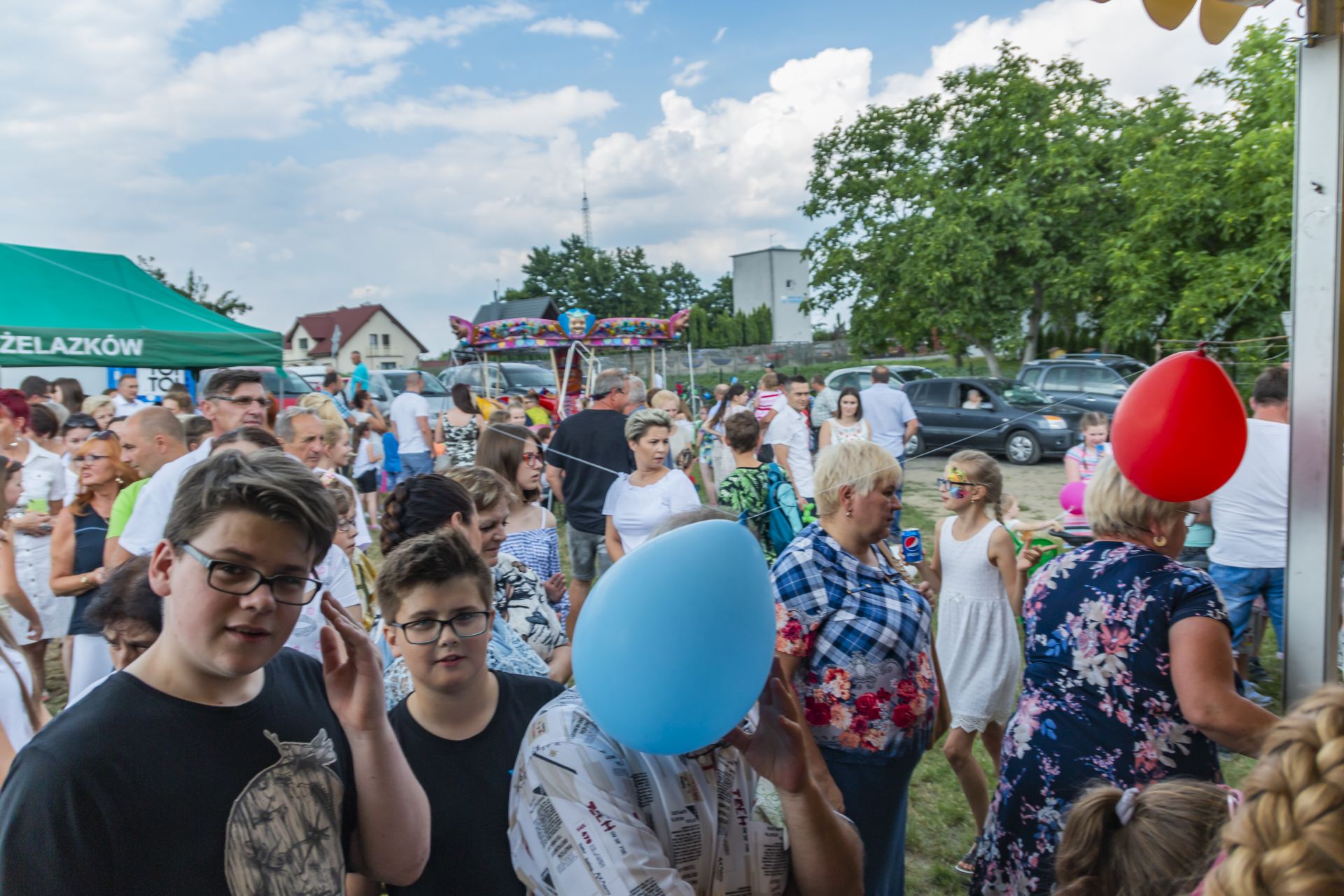 Po południu na łące za kaplicą odbył się festyn parafialny. Było mnóstwo atrakcji przygotowanych dla dzieci - karuzele, iluzjonista, klaun, malowanie twarzy, robienie biżuterii, oraz różne gry i zabawy. Dla każdego też było coś do jedzenia - kiełbaski z grilla, ciasta, szaszłyki z owoców oraz przepyszny chleb ze smalcem. Każdy kto chciał - i dla kogo starczyło losów - mógł również wziąć udział w loterii fantowej. Okazało się, że zainteresowanie loterią było tak duże, że przygotowane 500 losów rozeszło się bardzo szybko. Dochód z całego festynu przeznaczony jest na budowę naszego kościoła.