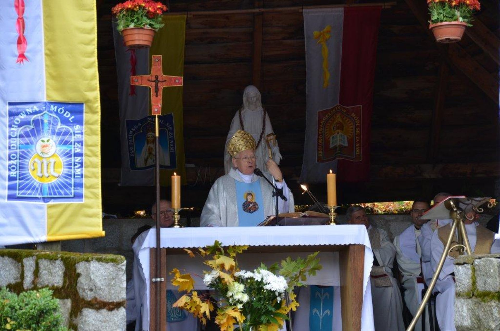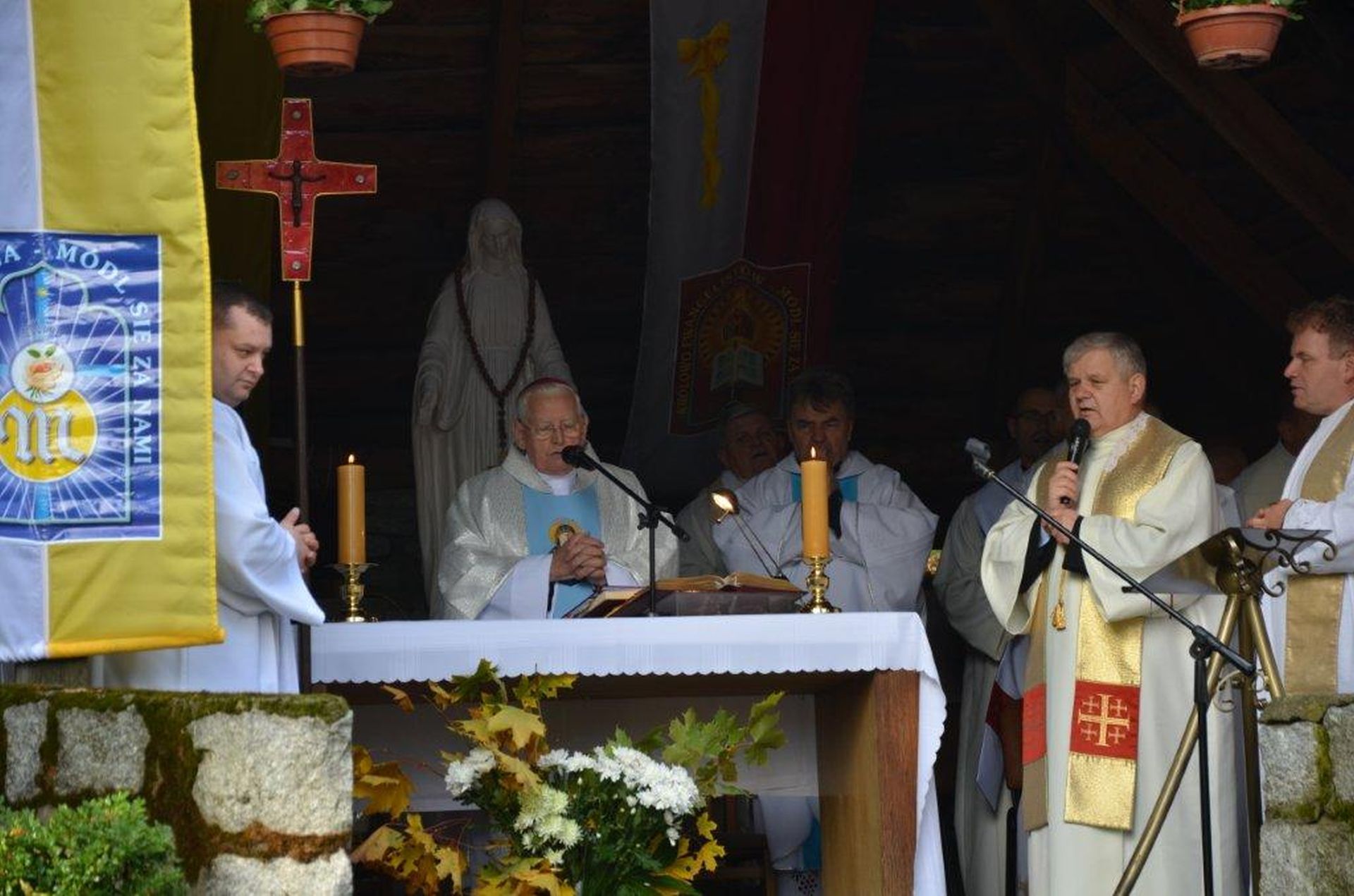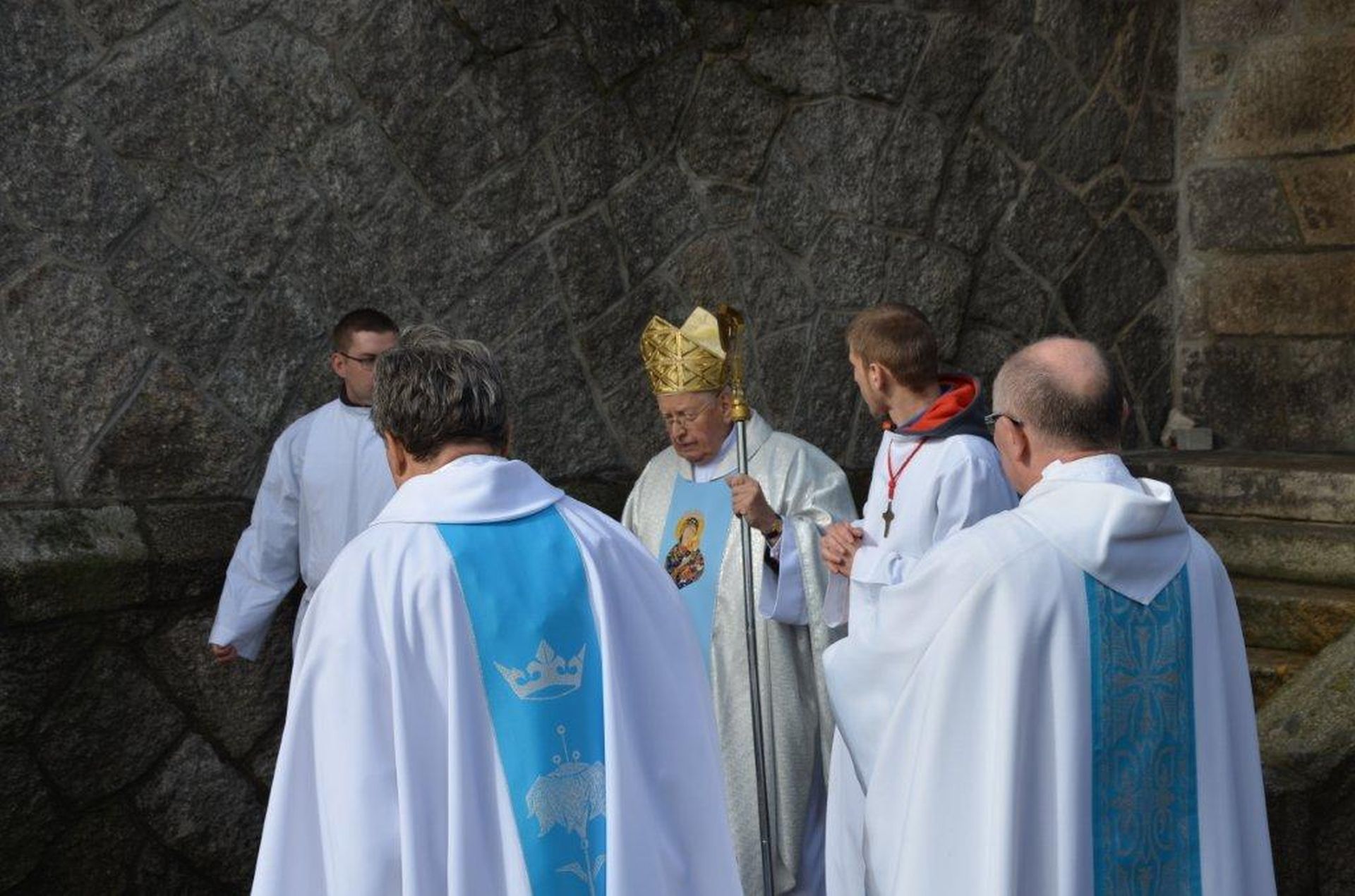 Na miejscu przybyłych pielgrzymów powitał proboszcz tamtejszej parafii – ks. Bogusław Sawaryn. Następnie sprawowana była Eucharystia, pod przewodnictwem ks. biskupa Stefana Cichego – biskupa seniora diecezji legnickiej. Wśród koncelebrujących znaleźli się m.in. wymienieni wyżej kaliscy proboszczowie oraz urodzony w Jeleniej Górze ks. prof. Paweł Bortkiewicz, teolog, członek Towarzystwa Chrystusowego dla Polonii Zagranicznej. W wygłoszonym słowie ks. biskup Cichy podkreślił siłę i moc różańca w walce ze złem na przestrzeni wieków. Wezwał do wytrwałości w modlitwie różańcowej i pełnego oddania się w ręce Matki Bożej.