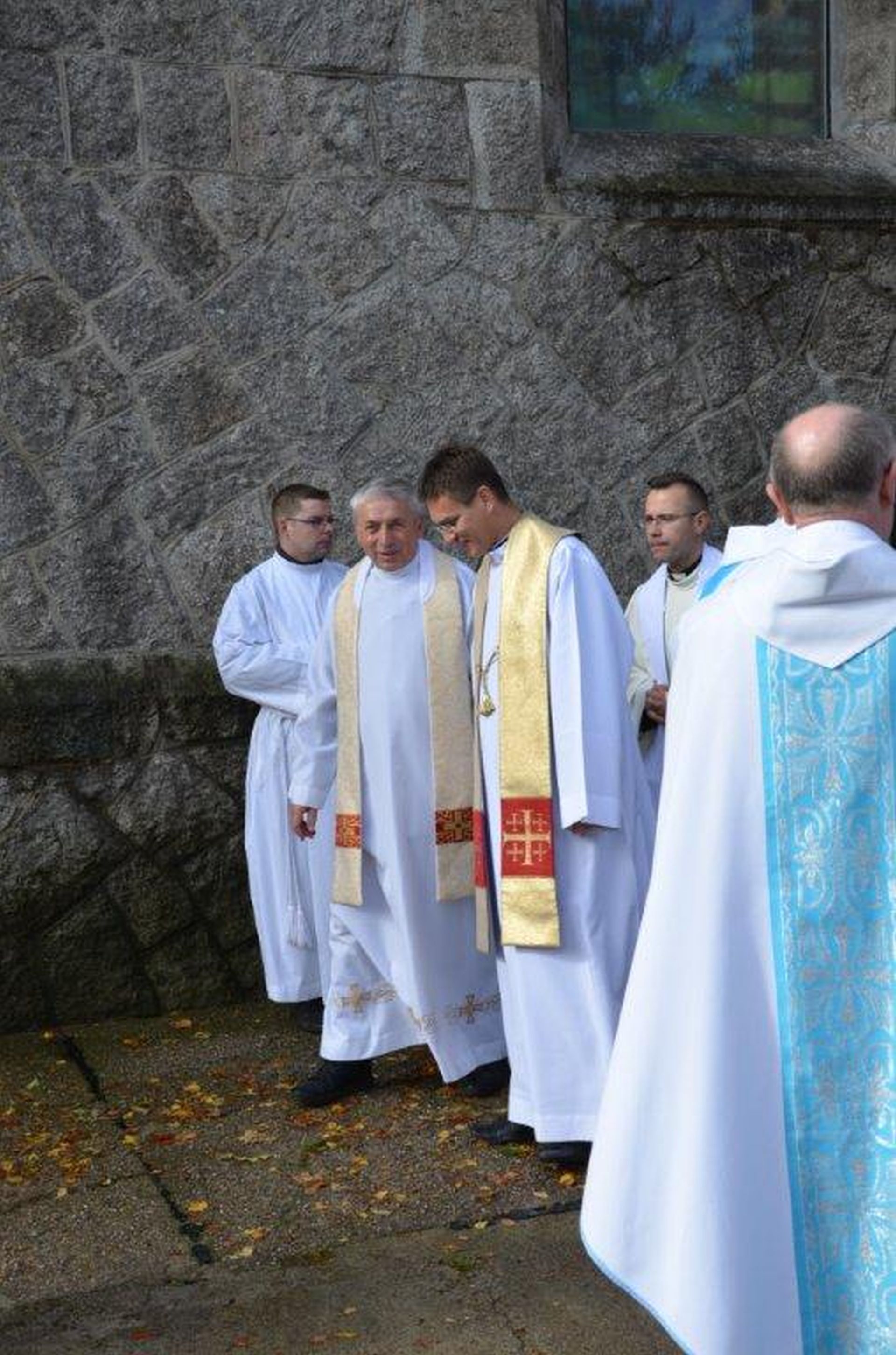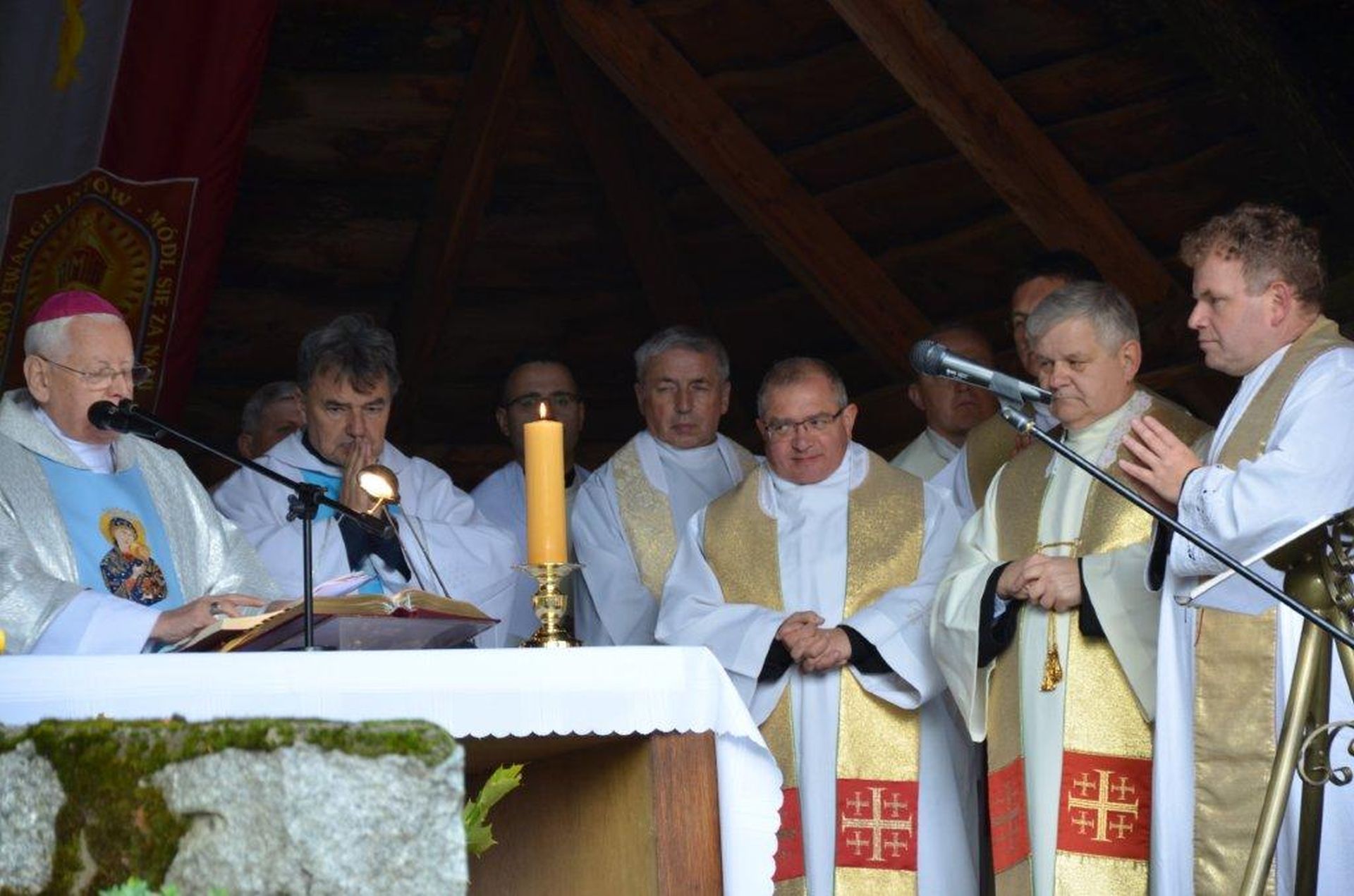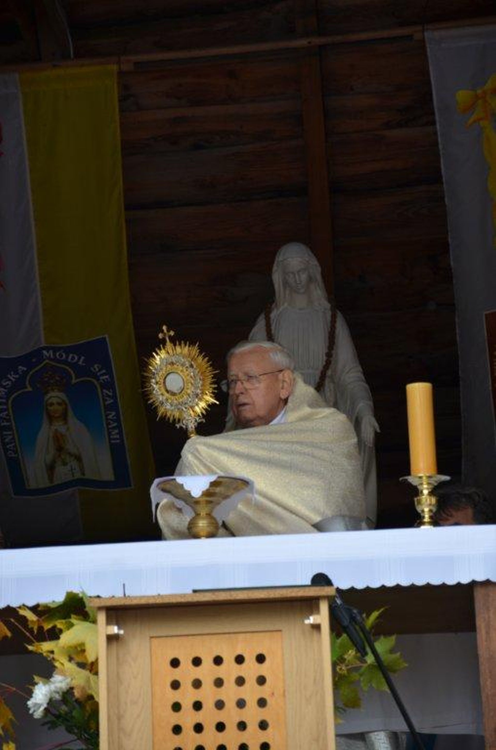Na miejscu przybyłych pielgrzymów powitał proboszcz tamtejszej parafii – ks. Bogusław Sawaryn. Następnie sprawowana była Eucharystia, pod przewodnictwem ks. biskupa Stefana Cichego – biskupa seniora diecezji legnickiej. Wśród koncelebrujących znaleźli się m.in. wymienieni wyżej kaliscy proboszczowie oraz urodzony w Jeleniej Górze ks. prof. Paweł Bortkiewicz, teolog, członek Towarzystwa Chrystusowego dla Polonii Zagranicznej. W wygłoszonym słowie ks. biskup Cichy podkreślił siłę i moc różańca w walce ze złem na przestrzeni wieków. Wezwał do wytrwałości w modlitwie różańcowej i pełnego oddania się w ręce Matki Bożej.