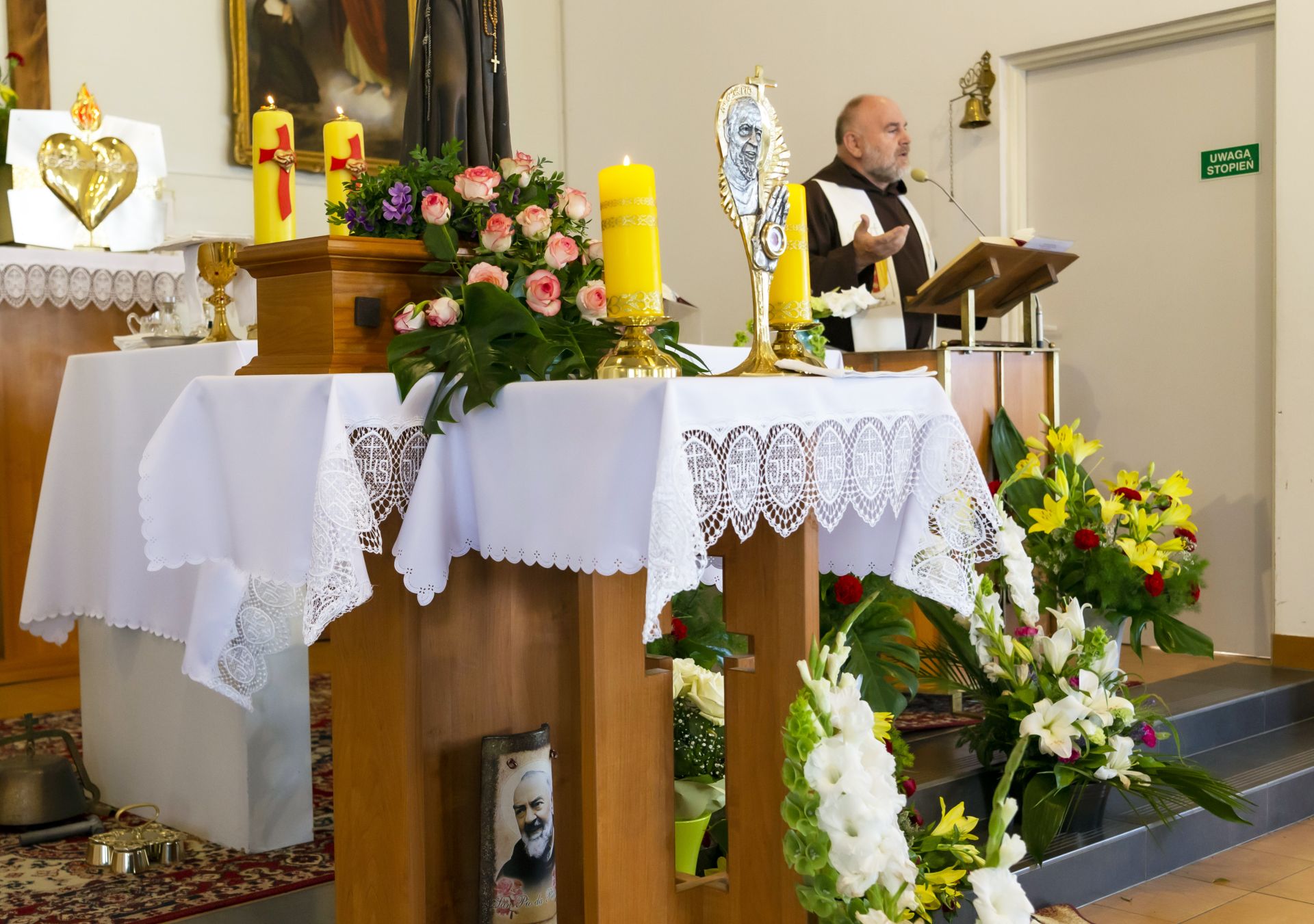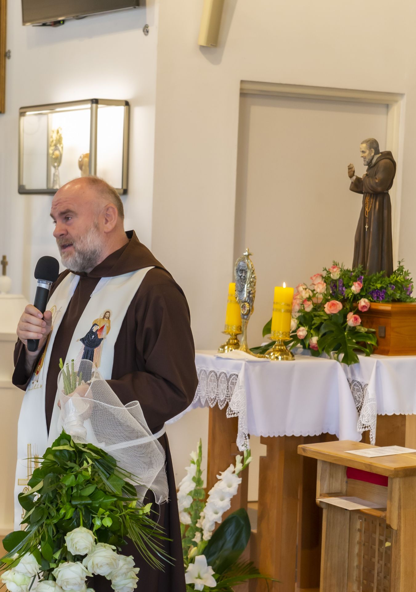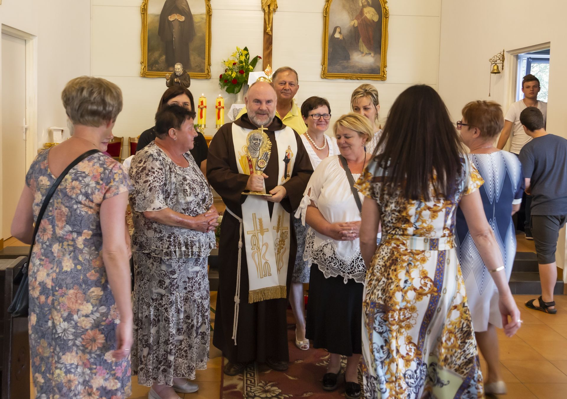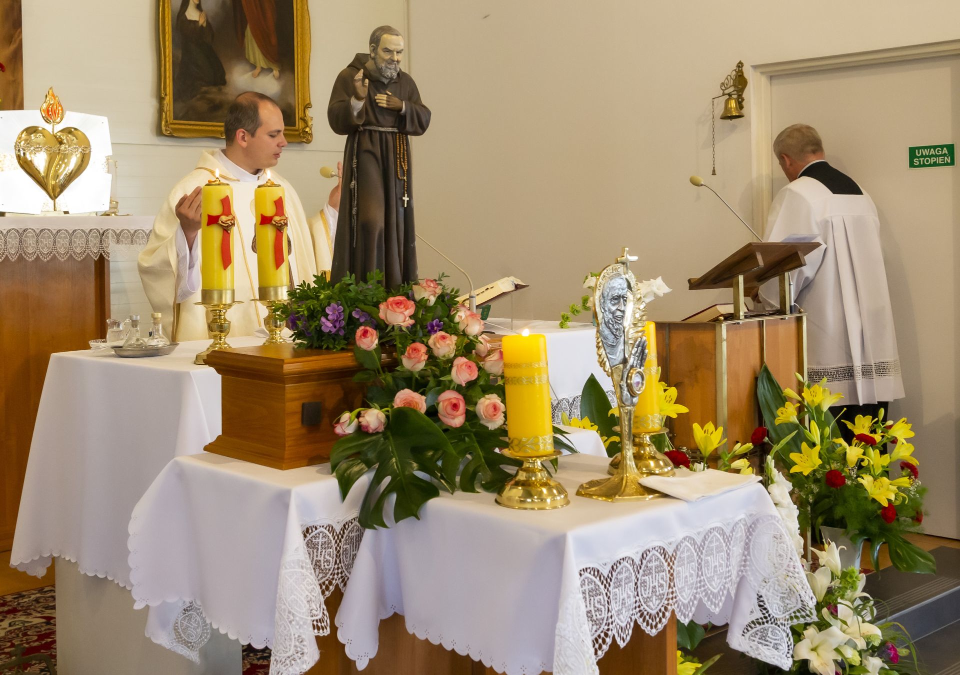W niedzielę 23 czerwca uroczyście wprowadzono do naszej kaplicy relikwie św. Ojca Pio, dokonał tego krajowy duszpasterz grup modlitewnych Ojca Pio, kapucyn ojciec Roman Rusek. W homiliach głoszonych podczas wszystkich Mszy św. przybliżył on sylwetkę Świętego, a po Mszach św. parafianie mogli oddać cześć relikwiom